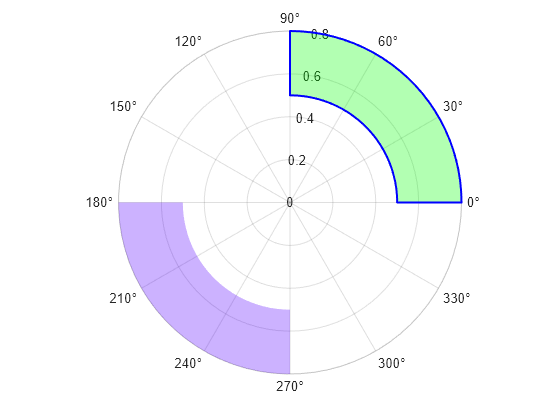 For example, create two green filled rectangles: one in the first (upper-right) quadrant and the other in the third (lower-left) quadrant. Specify an output argument to store the PolarRegion objects so that you can modify them later.