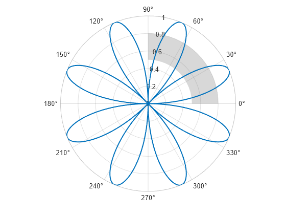 using thetas,radii,Name=Value)polarregion([0 pi],[0.25 1],FaceColor="yellow"). For a list of