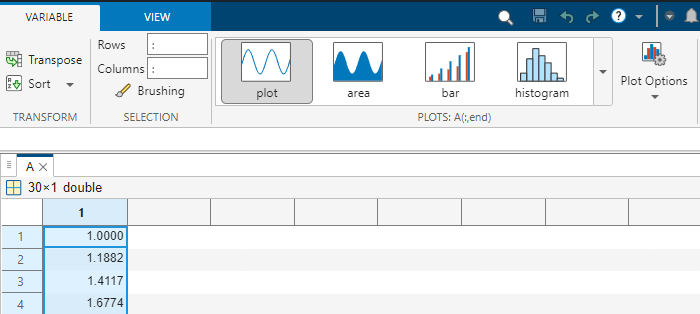 openvar(varname), wherevarnameis a string scalar or character vector specifying the name of a variable in the MATLAB workspace.