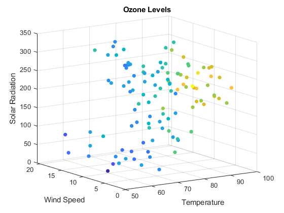 title('Ozone Levels') xlabel('Temperature') ylabel('Wind Speed') zlabel('Solar Radiation')