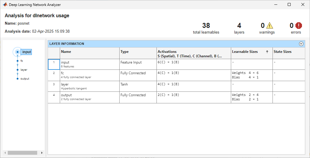 You can also use the analyzeNetwork function from Deep Learning Toolbox to visualize and understand the architecture of the trained ARNN (posnet). You can also use this utility function to check if the architecture of the trained ARNN is correct and detect problems (if any).