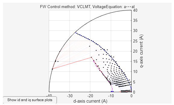 In the generated figure as shown below, observe the look-up tables of reference currents plotted in the id-iq plane. Every black dot corresponds to a computed optimal reference current pair at the chosen operating speed and load toque.