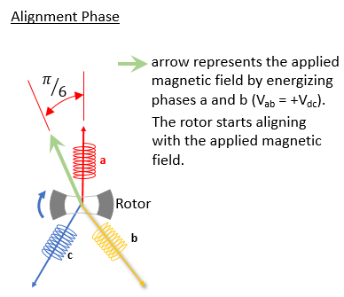 During the motor alignment stage, the example algorithm energizes two phases of the motor (phases a and b). The resulting magnetic field forces the rotor to align at 30-degrees (electrical position) from phase-a axis.