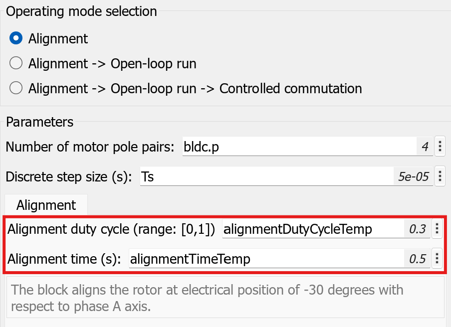 The example uses the alignmentDutyCycleTemp variable to compute and apply a DC voltage (proportional to alignmentDutyCycleTemp) to the phases a and b for the time that you specify using the alignmentTimeTemp variable. Increasing alignmentDutyCycleTemp increases the applied stator voltages, and therefore increases the DC current drawn by the motor. Increasing alignmentTimeTemp increases the time duration for which the DC voltage is applied to the motor. The value of alignmentTimeTemp can be determined using simulation or by deploying the code on hardware and taking measurements from the same.