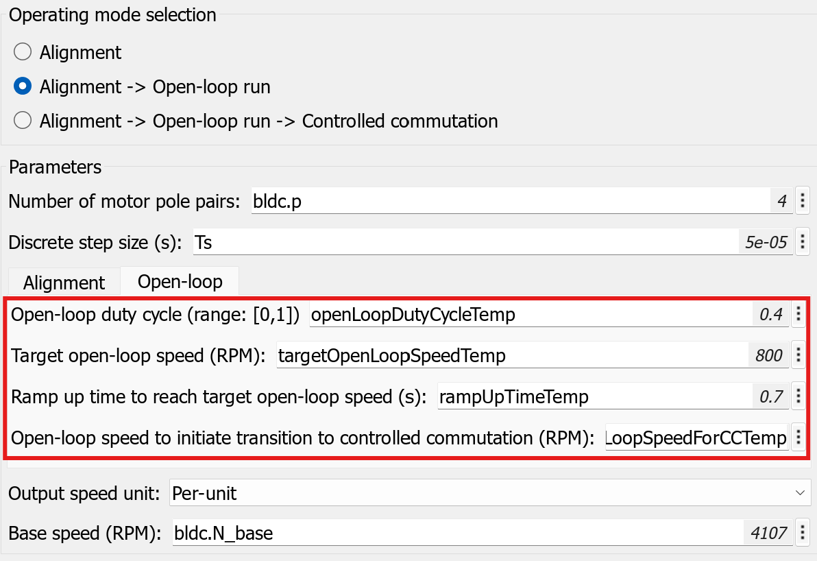 The targetOpenLoopSpeedTemp and rampUpTimeTemp parameters define the acceleration that the example uses to attain the target open-loop speed.