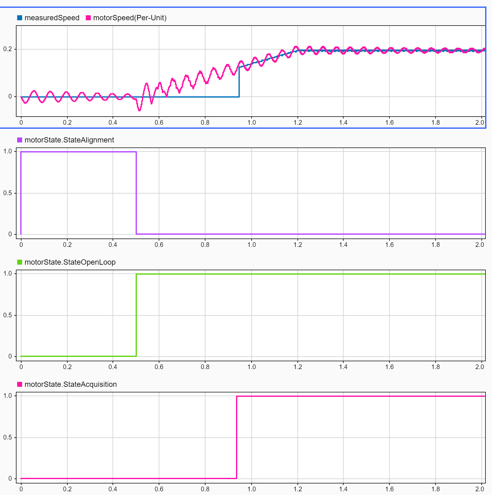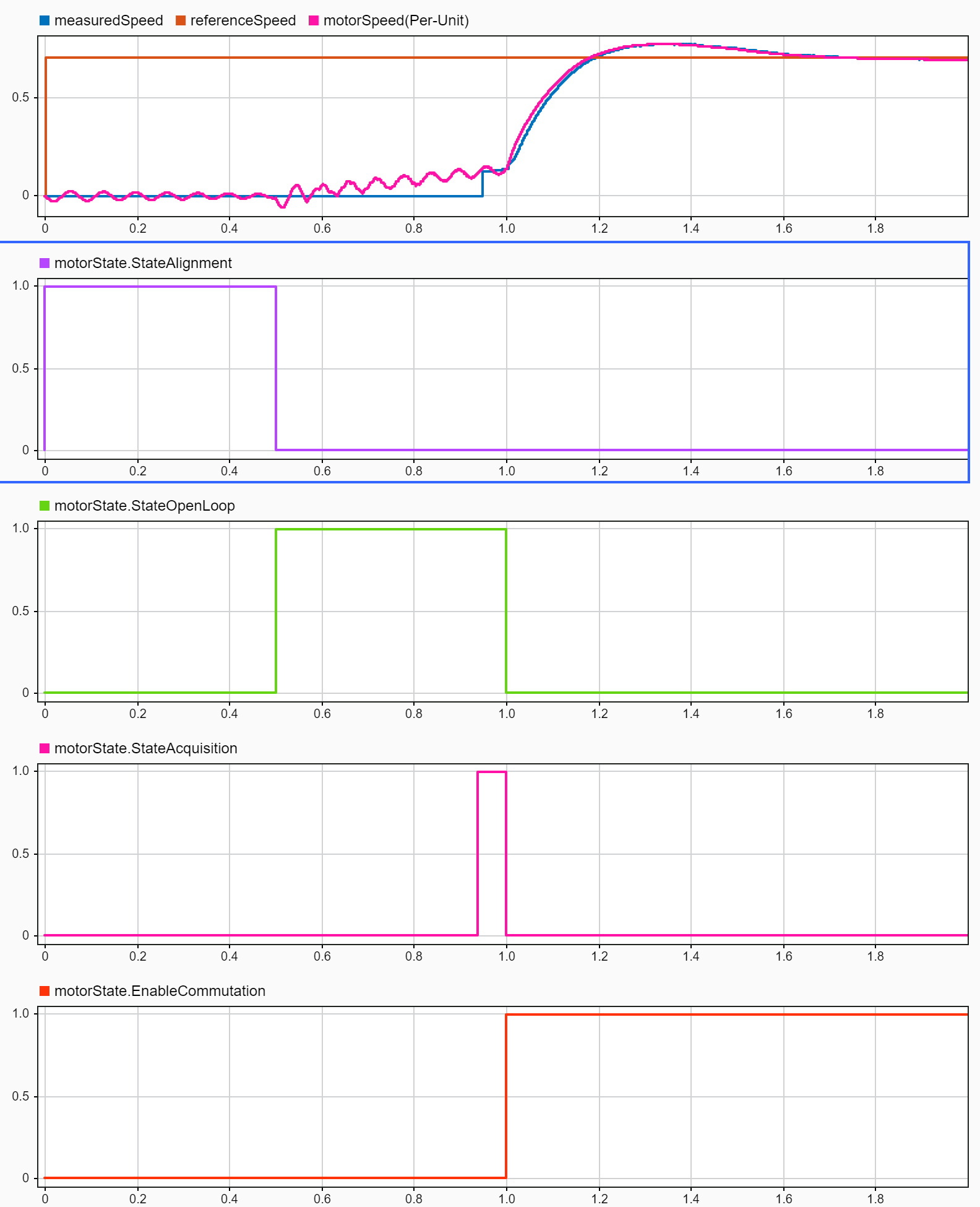 Note: To measure alignment time on hardware, the example model and the host model need to be modified to use a physical sensor (such as quadrature encoder sensor) available in your motor along with the LAUNCHXL-F28379D controller board.