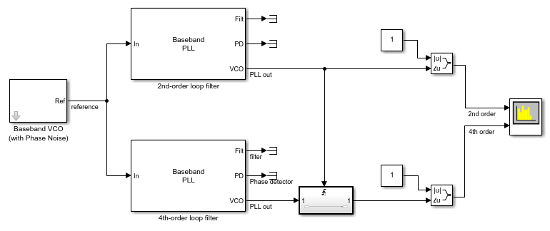 The Baseband PLL block models PLLs in the phase domain. The block accepts a real-valued phase offset vector and produces the outputs for a loop filter, phase detector, and VCO. The block acts as feedback control system that automatically adjusts the phase of a locally generated signal to match the phase of an input signal.