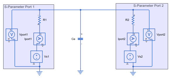 This example analyzes the T-coil circuit shown in this schematic diagram. Capacitor Ce is the capacitor to be impedance matched [3]. The schematic includes the equivalent circuits for two S-parameter ports. For more about S-parameter ports, see the S-Parameters section of the example.