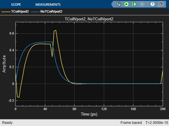 Run the simulation. In the scope display, view the pulse response of both the T-coil circuit and the unmatched shunt capacitor baseline circuit. Although the T-coil circuit introduces a little delay, the resulting pulse response is more desirable for data transmission with a flat top and more compact rising and falling edges.