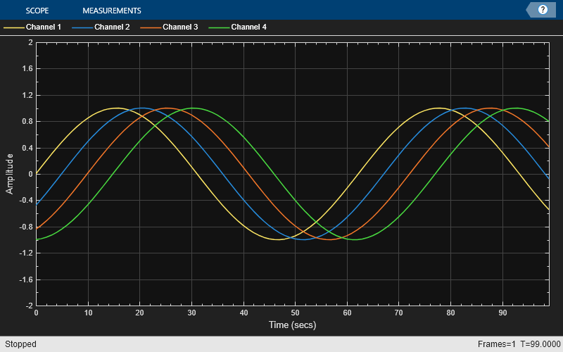 ts = timescope(YLimits=[-2 2]); x = linspace(0,10).'; y1 = sin(x); y2 = sin(x-0.5); y3 = sin(x-1); y4 = sin(x-1.5);