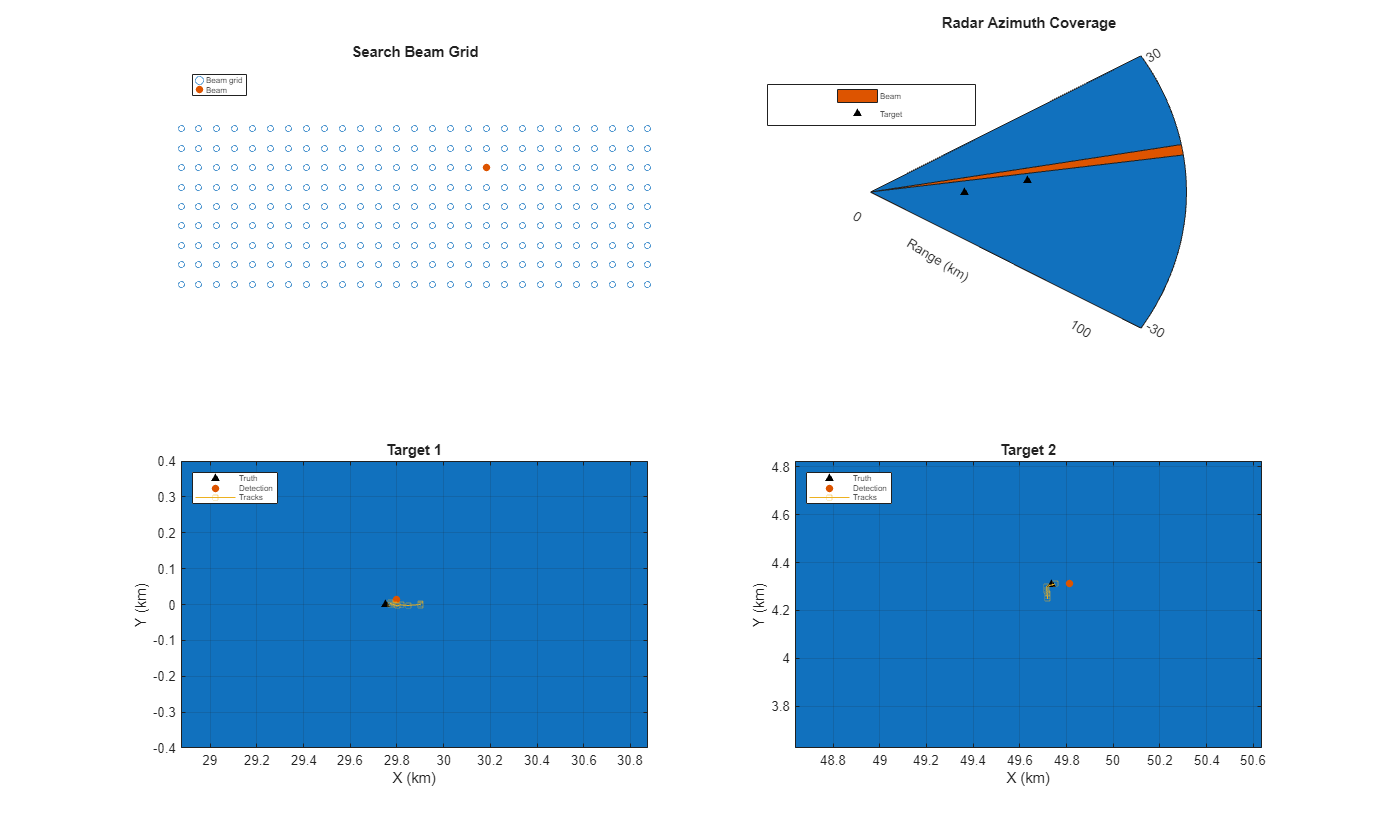 This example shows how to simulate a multifunction phased array radar system. A multifunction radar can perform jobs that usually require multiple traditional radars. Examples of traditional radars are scanning radars, which are responsible for searching targets, and tracking radars, which are responsible for tracking targets. In this example, the multifunction phased array radar performs both scanning (searching) and tracking tasks. Based on the detections and tracks obtained from the current echo, the radar decides what to do next to ensure that targets of interest are tracked and the desired airspace is searched. The multifunction phased array radar works as a closed loop, including features such as task scheduling, waveform selection, detection generation, and target tracking.
