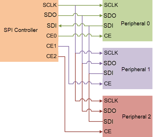 Each peripheral is wired to an individual chip-select or peripheral-transmit enable line. During SPI communication, the controller selects only one peripheral device at a time. Any other peripherals on the bus that has not been activated using its chip-select line must disregard the input clock and SDO signals. It also must not drive the SDI line.