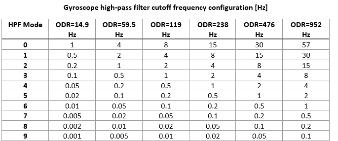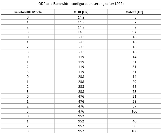 Select the desired bandwidth mode to set the cut-off frequency for the low-pass filter associated with the Gyroscope. Refer to the table for the information about the cut-off frequencies.