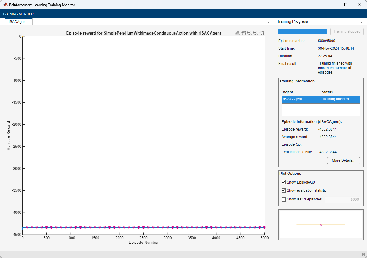 % Recreate the environment so it does not plot during training. env = rlPredefinedEnv("SimplePendulumWithImage-Continuous"); % Train the agent. Record the training time. tic ddpgTngRes = train(ddpgAgent,env,trainOpts,Evaluator=evl); ddpgTngTime = toc; % Extract the number of training episodes and the number of total steps. ddpgTngEps = ddpgTngRes.EpisodeIndex(end); ddpgTngSteps = sum(ddpgTngRes.TotalAgentSteps); % Uncomment to save the trained agent and the training metrics. % save("cpsuImgBchDDPGData.mat", ... % "ddpgAgent","ddpgTngEps","ddpgTngSteps","ddpgTngTime")
