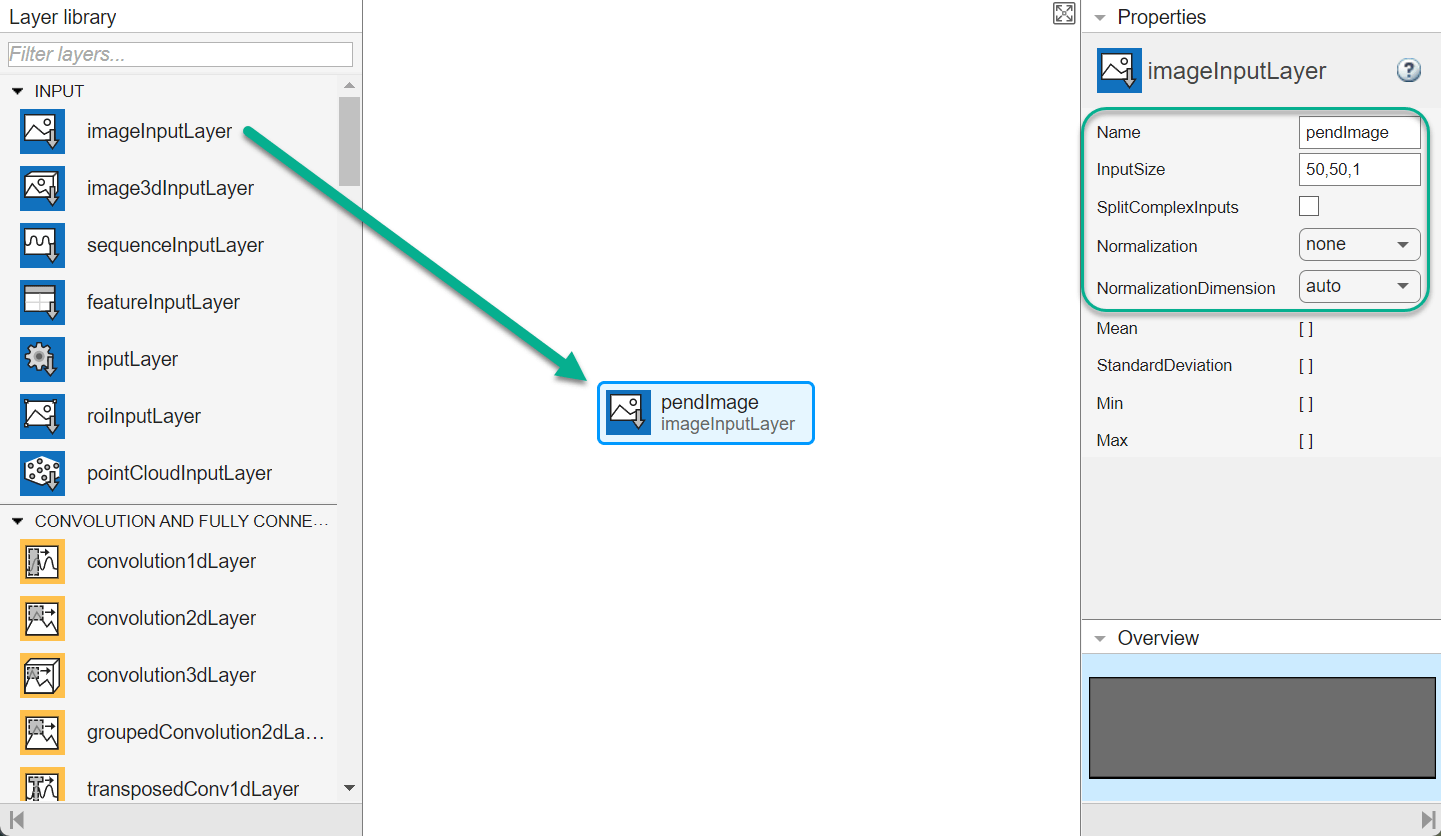 imageInputLayer([50 50 1],"Name","pendImage","Normalization","none")