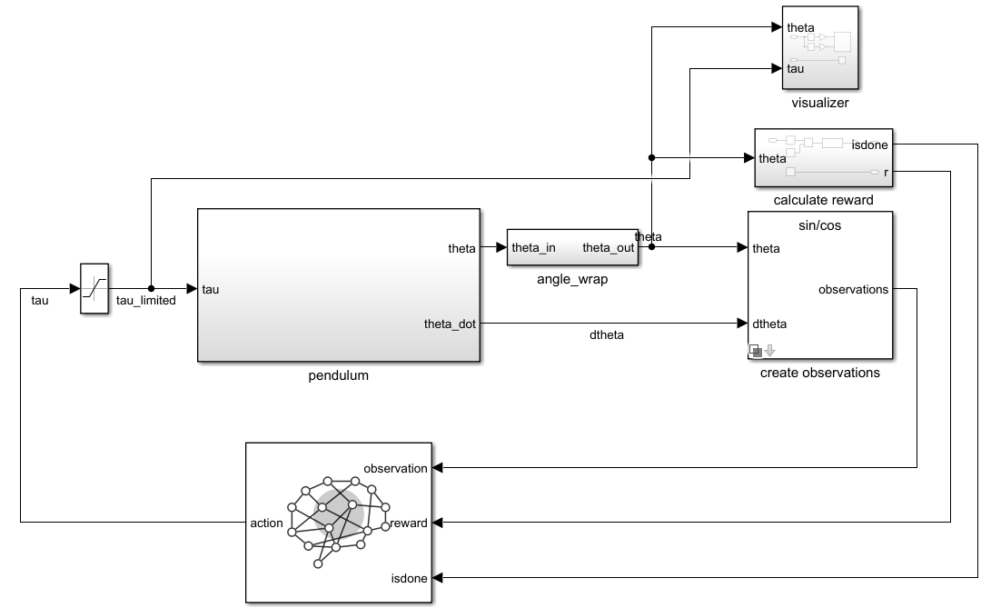 The reinforcement learning environment for this example is a simple frictionless pendulum that initially hangs in a downward position. The training goal is to make the pendulum stand upright and balanced. The environment is modeled in Simulink®.