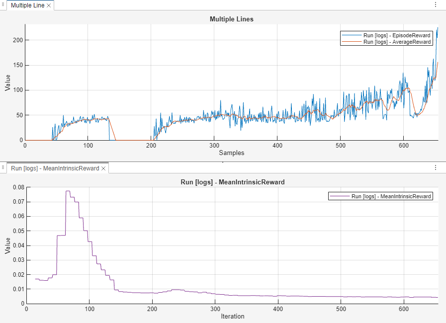 To examine the usefulness of using an exploration reward bonus in environments with sparse rewards, run two training sessions. In the first session, train the custom PPO agent with RND. In the second session, do not use RND. The example creates the plots using the logged data and the Reinforcement Learning Data Viewer tool. See rlDataViewer for more information.