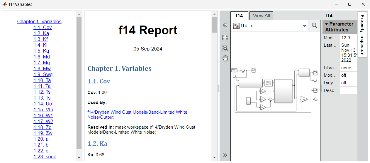 model_name = "f14"; load_system(model_name); rptName = sprintf('%sVariables',model_name); load_system(model_name); rpt = SystemDesignVariables(rptName,model_name); fill(rpt); close(rpt); rptview(rptName);