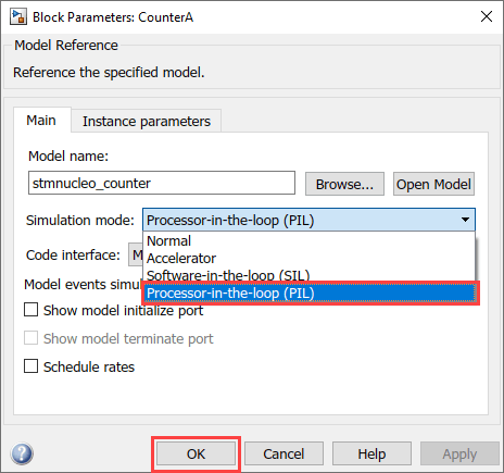 3. Configure and run CounterA Model block in PIL simulation mode by following steps below: