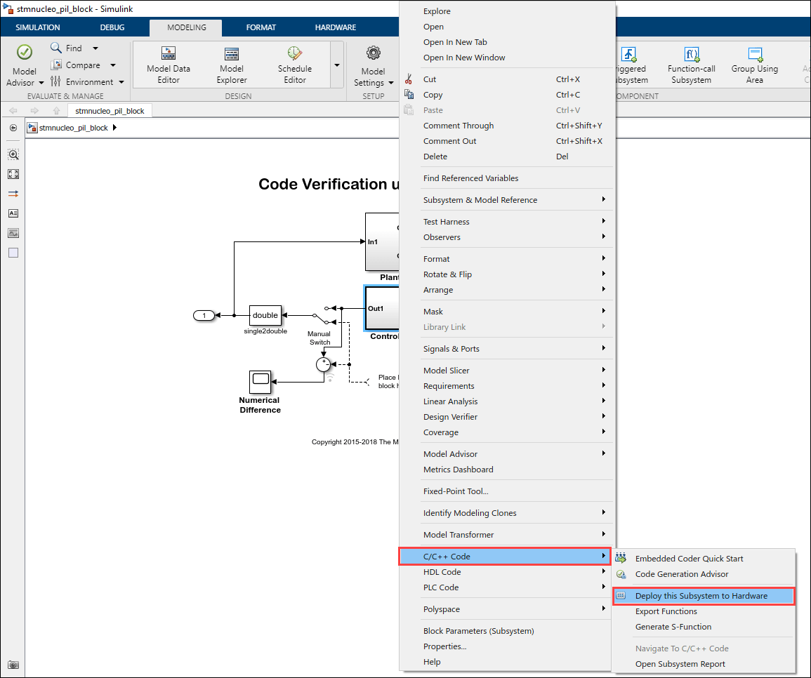 This example shows you how to use Simulink® Coder™ Support Package for code verification and validation with PIL using STMicroelectronics® Nucleo Boards. The PIL feature requires Embedded Coder®.