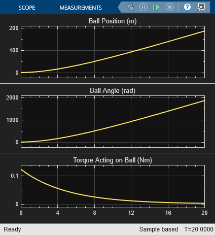The ramp has a 30-degree slope, and the ball starts at rest. Gravity applies a force along the slope, causing the ball to roll. A linear damper models air resistance, so the ball reaches terminal velocity when damping balances torque due to the gravitational torque.