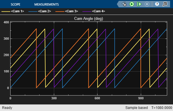 During the simulation, the cams complete three revolutions. The Rotational Motion Sensors wrap the angle between 0 and 360 degrees, making it easier to visualize each revolution in the scope. The scope results verify the initial angles of each cam.