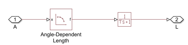 The input signal, A, represents the disc angle, while the output signal, L, is the disc axial length. The model includes a PS Lookup Table and a PS Transfer Function. The PS Lookup labeled Table, labeled "Angle-Dependent Length", outputs the disc's axial length as function of the disc angle. to capture all key regions, it is convenient to define the brake disc angles from -90 to 270 degrees, as shown in the Disc-Caliper States table. The Table grid vector parameter spans this range. The Rotational Motion Sensor block, which feeds into input signal A, wraps the sensed angle at -90 degrees, ensuring A always stays between -90 and 270 degrees. Consequently, the PS Lookup Table Extrapolation method does not affect the results.