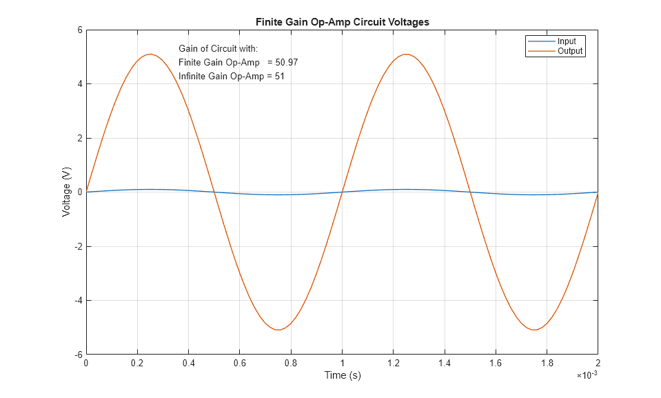 La gráfica "Finite Gain Op-Amp Circuit Voltages" muestra las tensiones de entrada y salida del circuito. Si el circuito utilizase un amplificador operacional de ganancia infinita sin resistencias de entrada y salida definidas, la ganancia sería 1+R2/R1 = 51. Puesto que este modelo utiliza un amplificador operacional con ganancia finita y resistencias de entrada y salida, la ganancia del circuito es ligeramente menor.