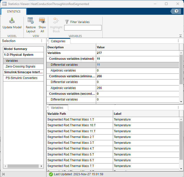 Statistics Viewer de Simscape confirma el número de variables diferenciales de cada modelo. Para ver las estadísticas de modelo, en la ventana del modelo, en la pestaña Debug, haga clic en Simscape > Statistics Viewer.