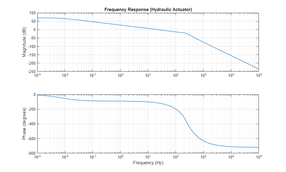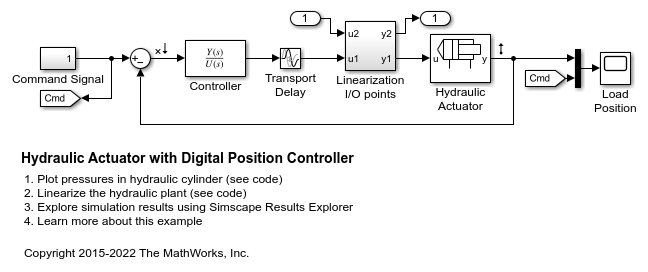 Este ejemplo muestra una válvula de dos vías que actúa en un circuito de lazo cerrado junto con un cilindro de doble efecto implementada en el dominio de líquidos isotérmicos. El controlador se representa como una función de transferencia en tiempo continuo más un retraso de transporte. El retraso permite el tiempo computacional (un periodo de tiempo discreto) más la retención de orden cero (medio periodo de tiempo discreto) cuando se implementa en tiempo discreto. El modelo está configurado para la linealización de manera que se pueda generar una respuesta en frecuencia. Para configurar una simulación en escritorio más rápida, desactive el retraso de transporte y aumente el tamaño de paso máximo del solver.