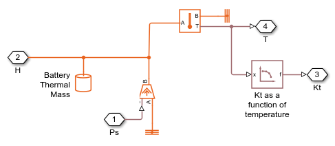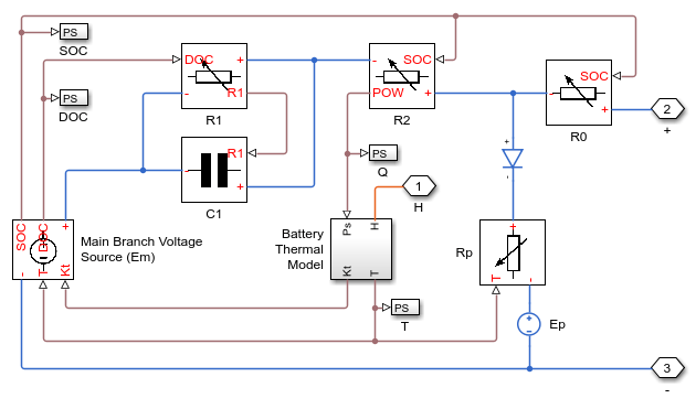 Implementar ecuaciones no lineales de los componentes del circuito equivalente en Simscape (en lugar de modelar en Simulink®) relaciona más claramente los componentes del modelo con las ecuaciones físicas que los definen. Para las ecuaciones de definición y su validación, consulte Jackey, R. "A Simple, Effective Lead-Acid Battery Modeling Process for Electrical System Component Selection", SAE World Congress & Exhibition, abril de 2007, ref. 2007-01-0778.