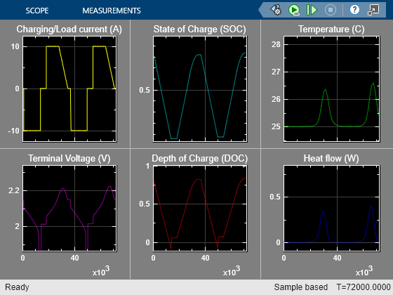 Este ejemplo incluye animaciones de la corriente, el estado de carga y la temperatura creadas con un bloque Circular Gauge y dos bloques Vertical Gauge de la biblioteca de Simulink > Dashboard > Customizable Blocks.