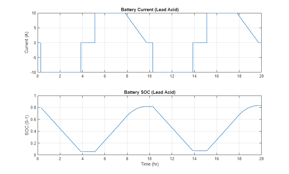 La siguiente figura de MATLAB muestra la corriente y el estado de carga de una batería. También puede ver estos datos en Simulation Data Inspector haciendo clic en el hipervínculo View battery current SOC en el área de diseño del modelo o haciendo clic en el botón Data Inspector en la pestaña Simulation del modelo.