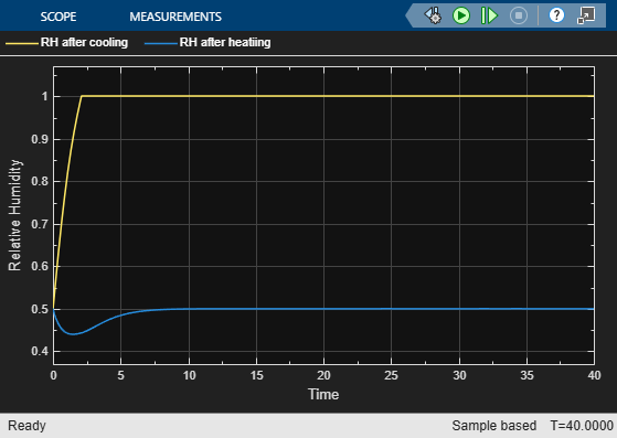 Simulate the model and open the Scope block. The relative humidity in the Cooling pipe reaches 1, which means that condensation can occur. The relative humidity leaving the Heating pipe is 0.5, which is the same as the relative humidity in the environment.