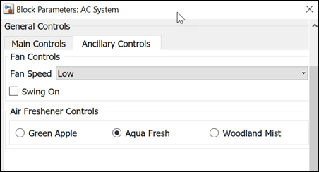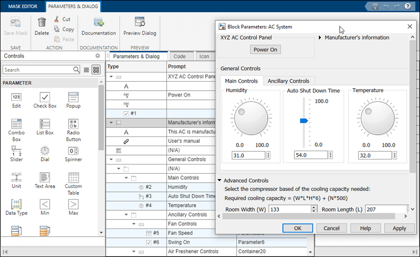 The General Controls section contains tabs to segregate and categorize information under Main Controls and Ancillary Controls. The Main Controls tab uses Dials and Slider to accept inputs for air conditioner parameters. You can edit the property of dial and slider in the property editor section of Mask Editor to place them horizontally or vertically.