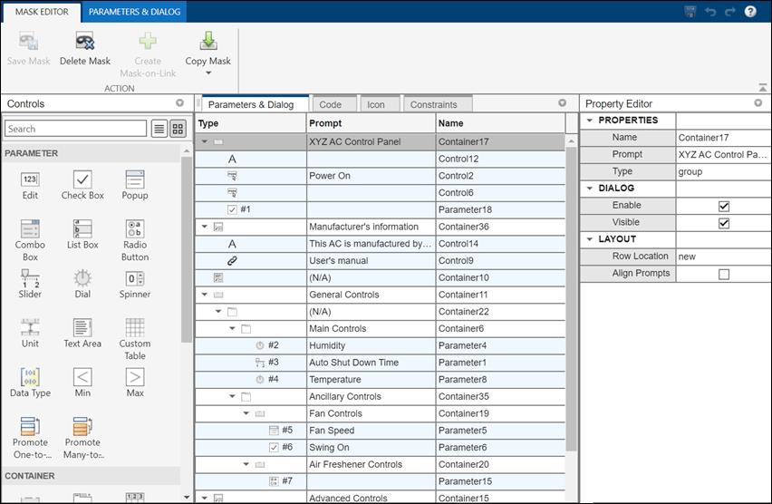 In the Mask Editor, use the Parameters & Dialogs pane to add controls on the mask dialog box and manage the mask dialog box layout. Select items from the Controls section to add parameters to the mask dialog box. Use the Property editor section to edit parameter properties.