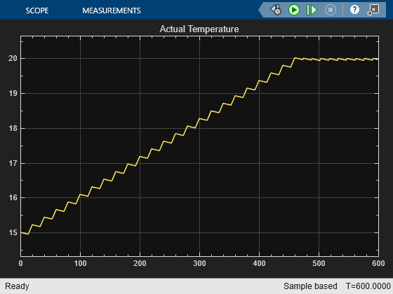 Simulate the model you created and observe the Scope block display. To ensure correct results, compare your Scope block display with the Scope block display mentioned here. Observe that, the initial boiler temperature is set at 15 deg C. The controller brings the boiler to reach its set point temperature of 20 deg C at approximately t = 450s. To know more about the Controller and the Boiler Plant subsystem, see Observe C Caller Block Exported Global Variables Without Model Modification.