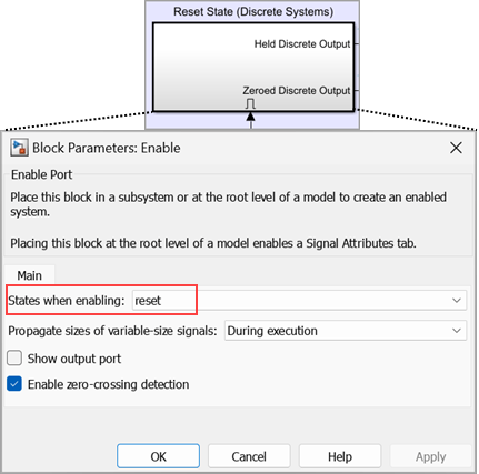 Here, the Reset State (Discrete Systems) subsystem is set to reset when disabled.