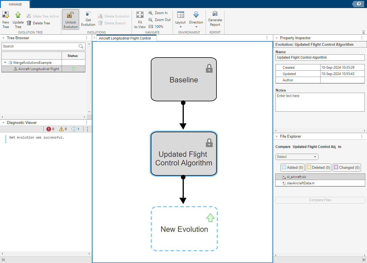 The Baseline evolution represents the starting point of this design. The Updated Flight Control Algorithm evolution records a set of changes a user made to the Baseline version of the model. The Baseline evolution and the Updated Flight Control Algorithm evolution are locked to prevent further changes from being recorded to these evolutions. The next time you update the evolution tree, changes made to project files will be recorded to a new evolution, represented as a child of the Updated Flight Control Algorithm evolution in the evolution tree.