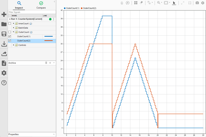 For example, the data logged to the workspace using signal logging does honor specified logging intervals. OuterCount is a wide signal with two elements. To display the logged values of OuterCount captured as part of signal logging, use the stem function, which ignores the interpolation settings of the data.