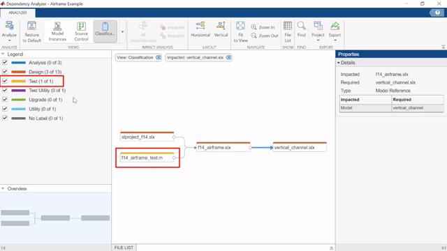 The graph shows two Design files and one Test file impacted by the changes you made to vertical_channel.slx. f14_airframe_test.m is the test you need to run to validate the design changes.