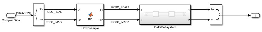 Open the ex_reusable_csc_model in the DEM_Coder_Example project. The model contains the nonreusable subsystem DeltaSubsystem and the MATLAB Function block Downsample. DeltaSubsystem contains the MATLAB Function blocks DeltaX and DeltaY. For more information on this model and how to specify buffer reuse for multiple signals in a path, see Specify Buffer Reuse for Signals in a Path (Embedded Coder).