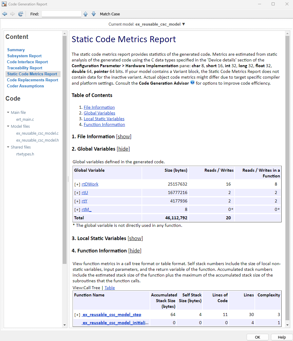 When you generate code, coder generates a report summarizing the results. The Static Code Metrics Report provides statistics of the generated code. In this example, you will use coder settings to optimize the metrics summarized in the Global Variables and Function Information sections of this report.