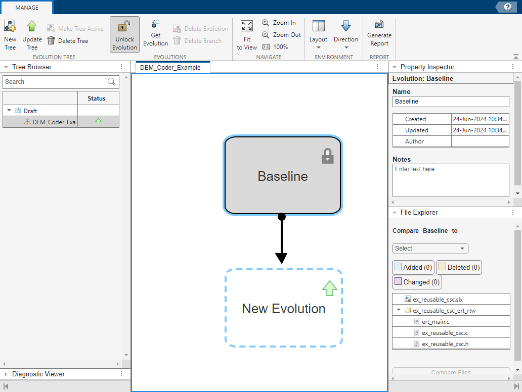 2. In the toolstrip, click Get Evolution. The app gets the version of files stored in the Baseline evolution into the project. The shape of the evolution tree changes to reflect a new branch in the design direction. The next evolution created will be a child of the Baseline evolution.
