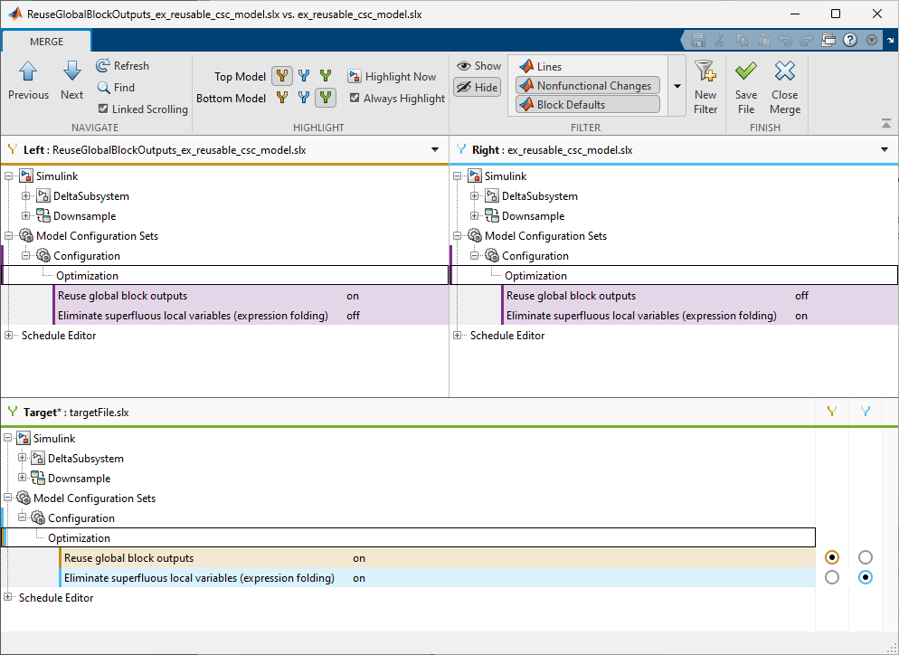 3. Merge differences from the Reuse global block outputs evolution into the active project files.