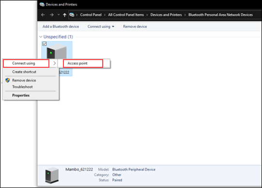 1. Right-click the selected Parrot Mambo minidrone and select Connect Using > Access Point.