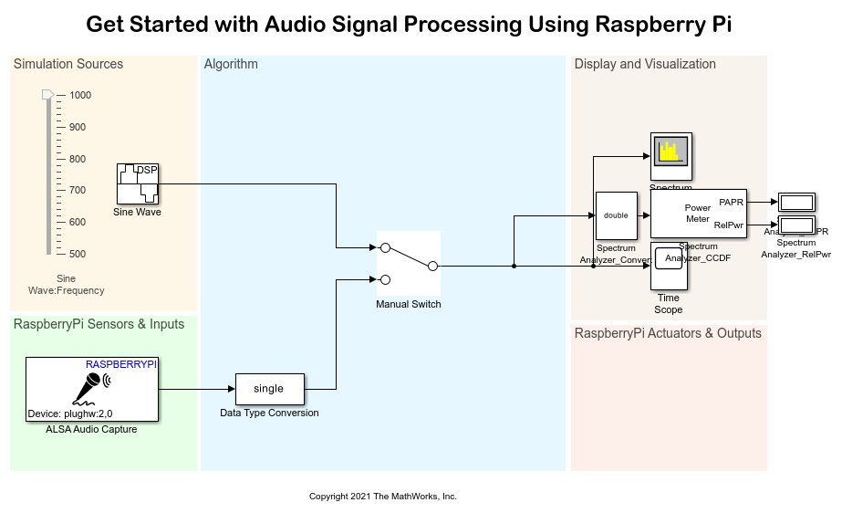 This example uses the Audio template that can be found under Simulink > Simulink Start Page > Simulink Support Package for Raspberry Pi Hardware.