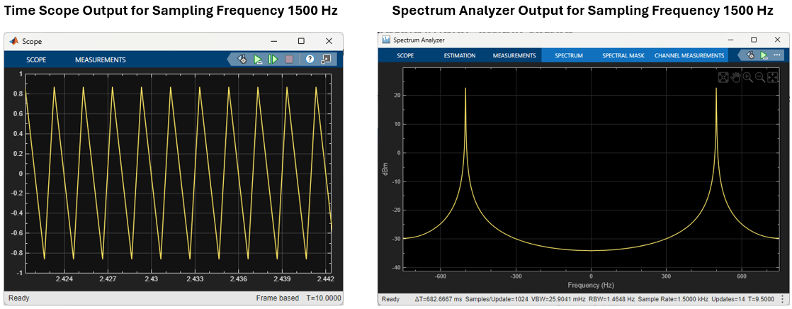 Time Scope and Spectrum Analyzer Output for Audio Signal with Sampling Frequency of 1500 Hz