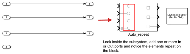Look inside the Auto_Repeat Subsystem block. Add one or more In or Out ports and observe the changes.