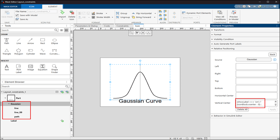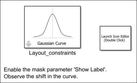 5. Save the icon and save the mask. Double-click the block Layout_constraints. In the mask dialog box, select Show Label, and observe that the text Gaussian Curve appears as a label on the block. The curve automatically adjusts its position to prevent any overlap with the label.
